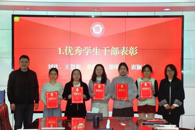 在208会议室召开优秀学生干部表彰、聘任暨学生工作研讨会。学院党委副书记耿云辉、学工主管刘敏、辅导员董润、兼职辅导员及助管参会,会议由学工主管刘敏主持。