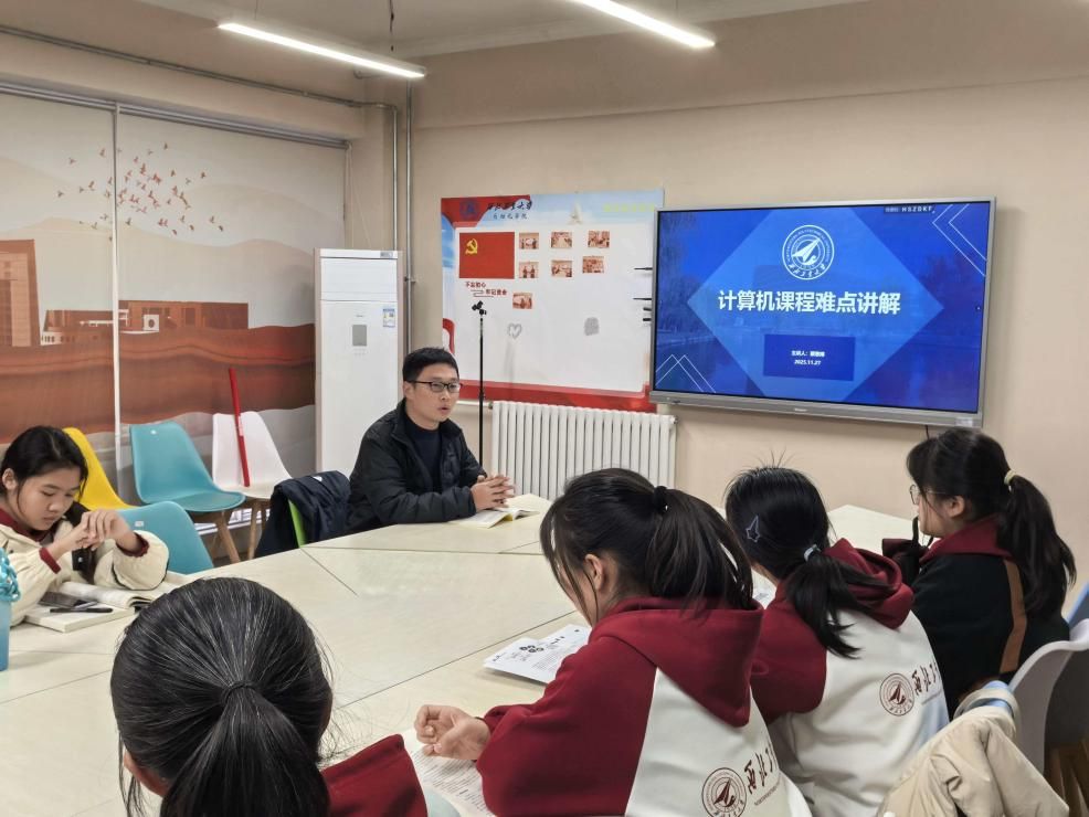辅导过程中,蔡思博首先用比喻生动解释了图灵机原理;随后讲解了数制间的转换,缓存、内存、外存的多级存储体系和多种智能算法机制等多个核心知识点。在答疑环节,同学们围绕递归实现、存储层次优化等话题展开讨论,蔡思博以例题讲解帮助同学们巩固知识。