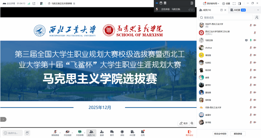 参赛选手精彩展示后,最终6名同学成功晋级校级复赛。评委老师围绕目标合理性、实践匹配度、规划可行性等维度进行评审,并就提升政治站位、优化目标衔接、加强实践锻炼等方面给予指导。本次选拔赛不仅为马理论专业学生提供了职业规划展示与交流的平台,也助力青年学子明晰发展方向、树立正确的就业观。