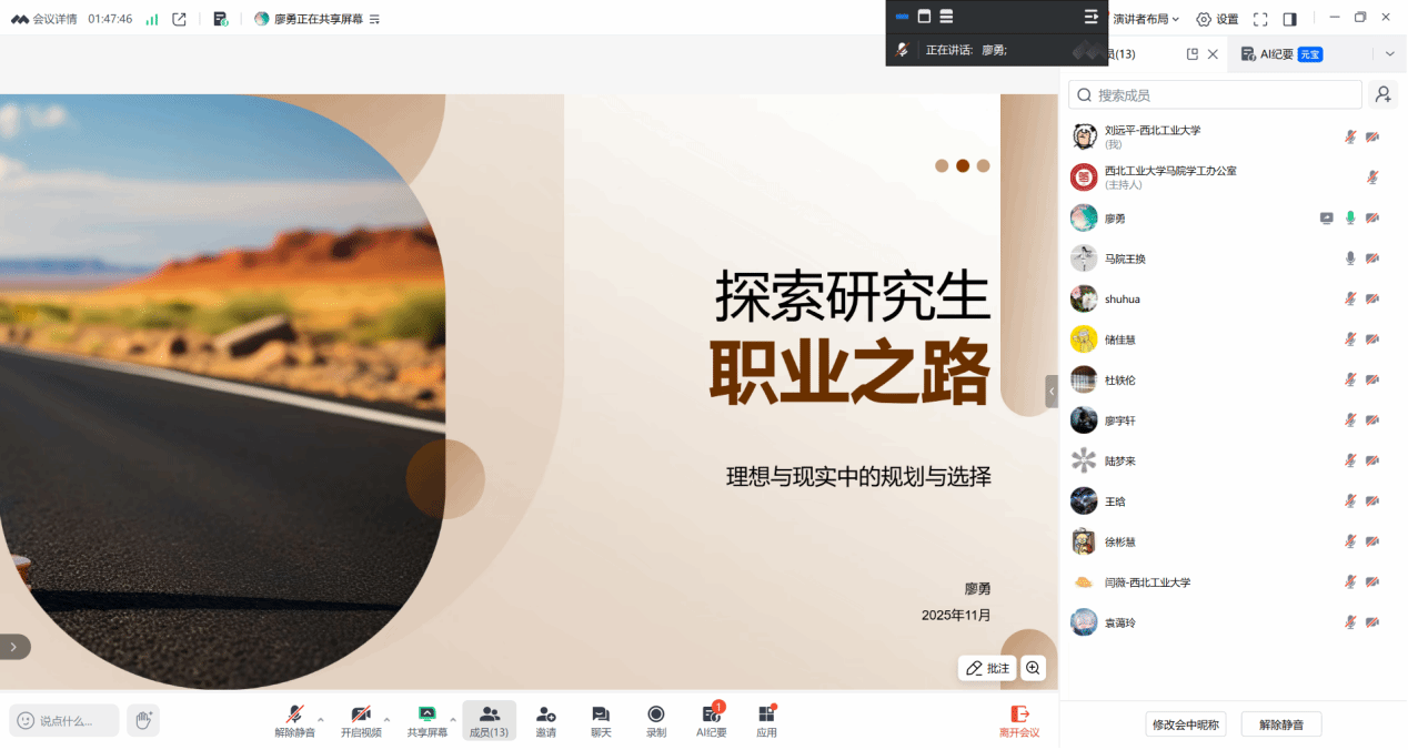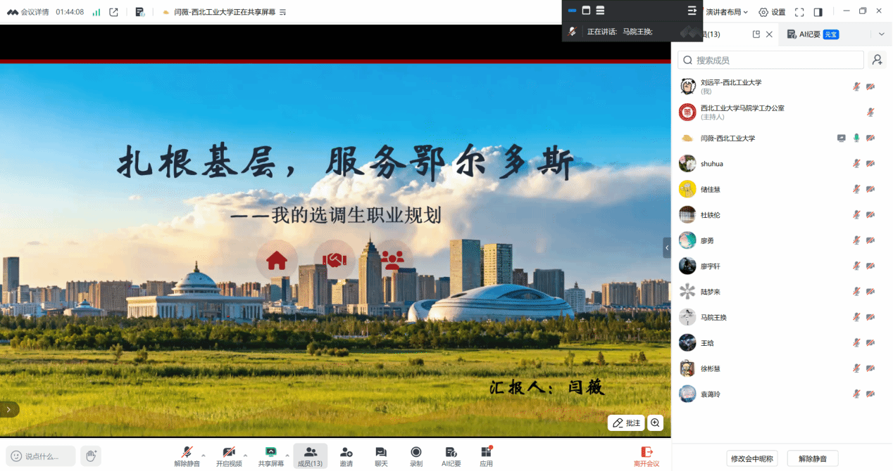 本次选拔赛设置成长赛道与就业赛道,7名马克思主义理论专业学子分赛道同台竞技。选手们的职业规划方案兼具思想深度和实践价值,充分展现了青马学子的理想追求与综合素养。成长赛道4名学子职业规划兼具理想与务实。桂志森聚焦马理论研究与教学,拟深耕社科学术厚土并打造工科特色思政课堂;袁蔼玲以高校思政课教师为目标,展现扎实功底与教学反思;徐彬慧创新“快板+中华优秀传统文化+实践传播”模式,规划职业发展路径;陆梦来结合自身特质,聚焦马克思主义中国化时代化等领域研究。