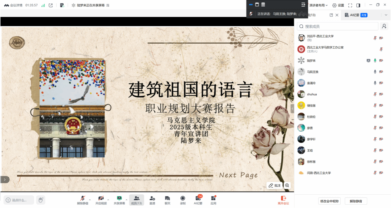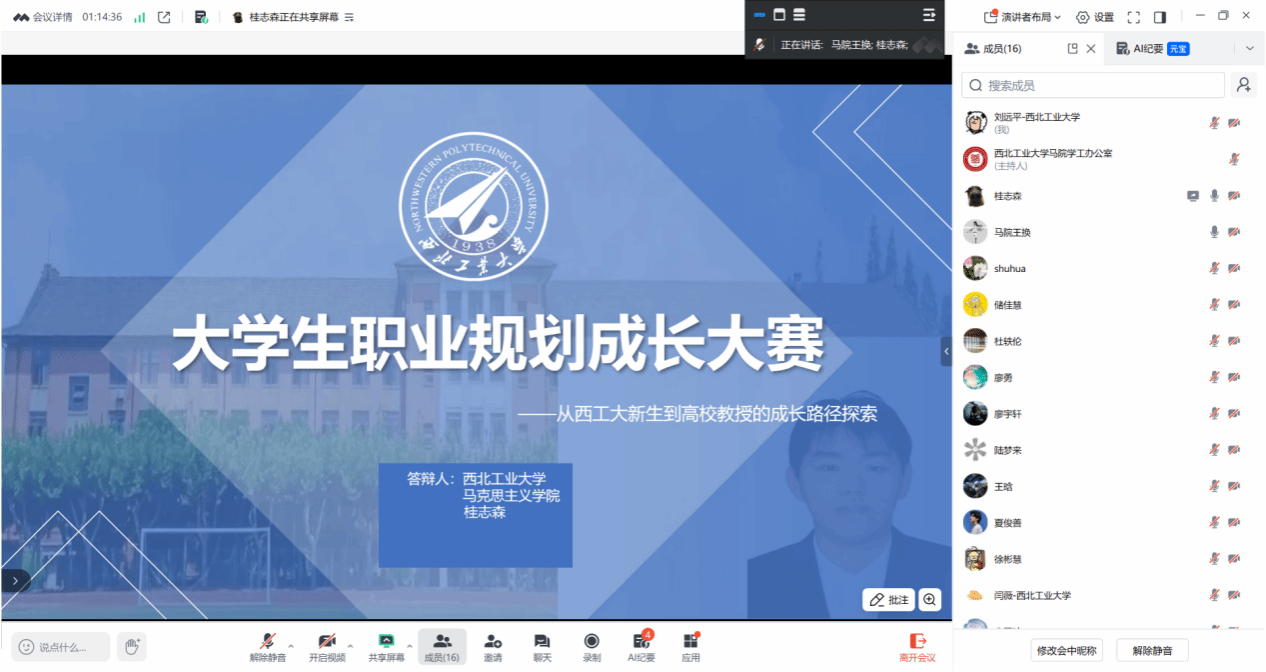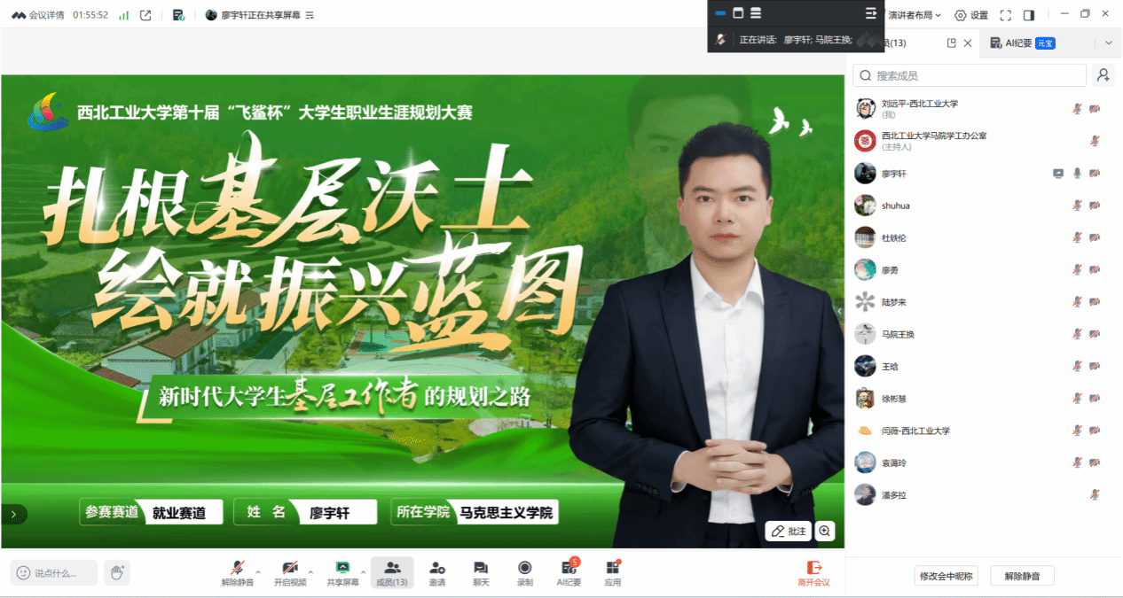 就业赛道的3名选手定位清晰、准备充分,凭借丰富的实践经历与精准的岗位适配规划脱颖而出。廖宇轩以基层治理为职业目标,结合汶川地震重建见闻、精准扶贫实践、社会调查经历阐明职业初心,充分展现西工大青年“专业精、系统强、重实践、能担当”的综合素养;闫薇规划务实,岗位适配性强;廖勇提出“马理论+物流”跨领域路径,立足区位优势展现多元思维。