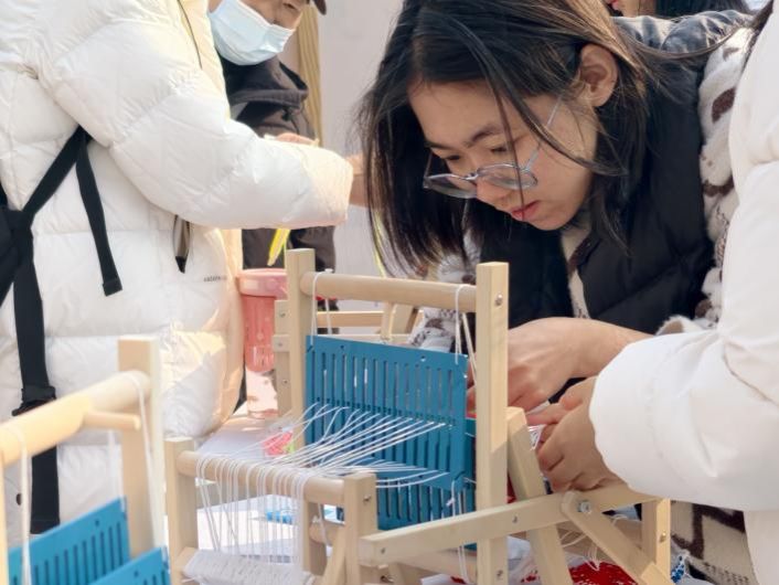 竹编制作区前人头攒动,学生们充分发挥创意,将普通的竹条编制成一个个精致的箩筐、竹篓、风铃;织布体验区布置的木制织布机吸引了同学们争相体验,大家从生疏地学习穿梭、挑纬,到编织出彩色纹样,沉浸在劳动的乐趣中。