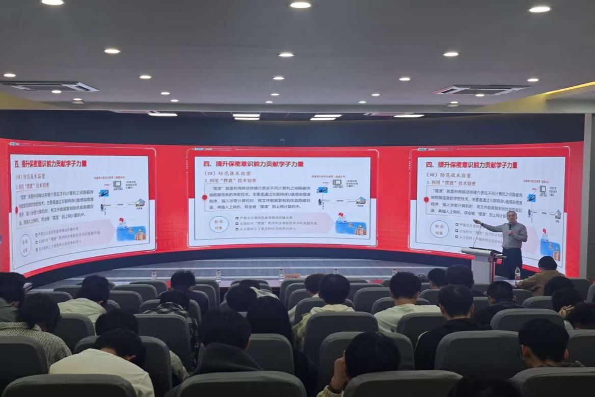 王革明围绕为什么要重视国家安全保密工作、高等院校国家安全保密工作风险点、学校国家安全保密工作组织与管理、提升保密意识、贡献学子力量等方面,结合典型案例和多年工作经验,强调要深刻认识保密工作的重要性,清醒把握当前复杂形势与风险挑战,在增强政治意识、坚守保密法律法规底线,深化责任意识、按学校保密制度和要求履行岗位职责,加强保密意识和能力建设、防范技术窃密等方面精准发力,切实筑牢学校安全保密防线。