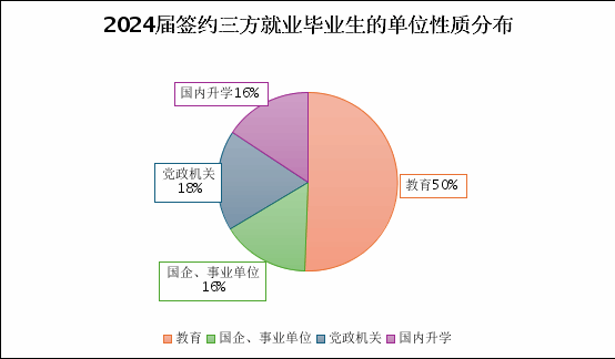 毕业生共计46人,整体就业率96%。其中,博士毕业生12人,就业率100%;硕士毕业生34人,就业率94%。总体而言,就业岗位与学科方向契合度强、硕士生升学率占比突出。从单位所属行业来看,毕业生就业人数较多的行业主要是教育行业,共计22人签约思政课教师、辅导员,占比50%。同时,硕博毕业生中有8人进入党政机关,其中4人选择选调生队伍,赴陕西、山西省份扎根基层、挺膺青春担当。针对2024届毕业生签约单位开展问卷调研,收到来自高等学校、职专院校、研究所、党政机关共18家用人单位的一致好评。