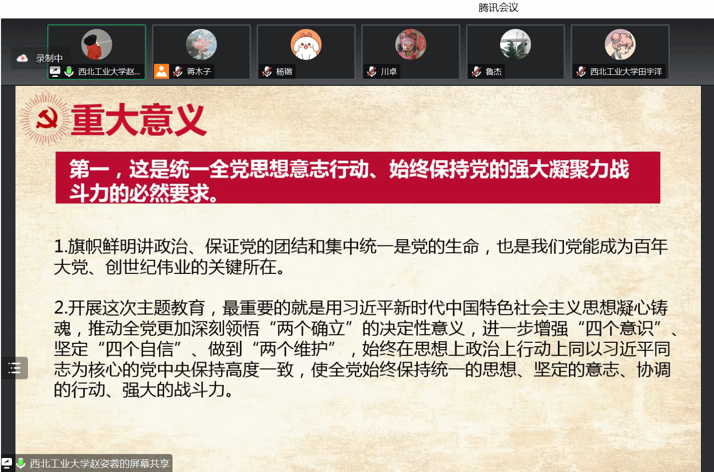 读书会的第一位导读人是我院硕士生赵姿蓉同学。第一个部分首先是从世情、国情、党情等方面来对此次主题教育的背景进行阐述:中国发展壮大,美国越来越“不安”;新时代需要新理论解决好高质量发展问题;解决大党独有难题。在对开展这次主题教育的重大意义进行理解时,除了对文本上的三个重要意义进行解释,更是引用了专家学者的研究论述,对习近平新时代中国特色社会主义思想的世界观方法论展开论述。第三部分是开展这次主题教育的目标要求,首先要牢牢把握总要求,其次要全面落实重点措施,最后是要紧紧锚定目标任务。第四部分是开展历次党内集中学习教育的意义,通过文本内容,结合专家学者有关党内集中教育的研究论述,从党内集中教育历史演进;开展党内集中教育的作用和意义研究;关于党内集中教育特征研究;关于党内集中教育的经验借鉴研究四个方面进行了自己的理解。