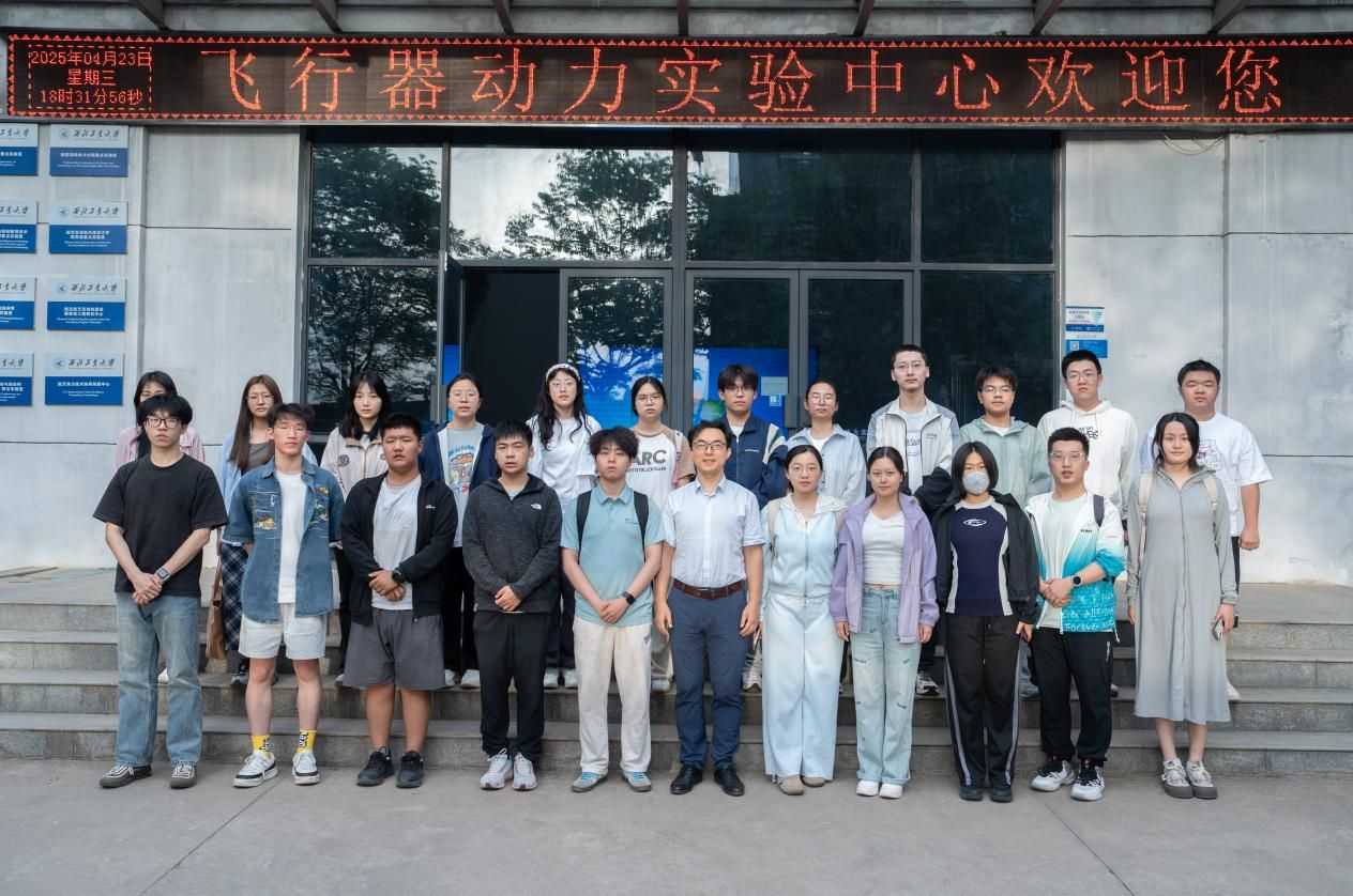 贾老师带领同学参观飞行器动力实验中心,亲身感受航空燃气涡轮发动机运转时的澎湃动力,随后通过对发动机核心部件精妙构造及其高效运转原理的深入讲解,让同学们更深刻理解了航空动力的科技魅力。